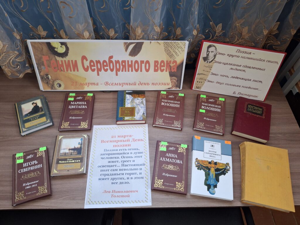 К Всемирному дню поэзии в библиотеке оформлена книжная выставка «Гении Серебряного века». Серебряный век – это эпоха выдающихся актёров, художников, писателей, композиторов, поэтов, живописцев, философов. Это время созидания, время новых направлений и открытий. Ни в одной стране, ни в одной национальной культуре мира XX век не дал такого её взлёта, как в России. Это был синтез, сплав реализма и романтизма, науки и полёта фантазии, действительности и мечты, сущего и должного, прошедшего и настоящего, озаряемых грядущим.
