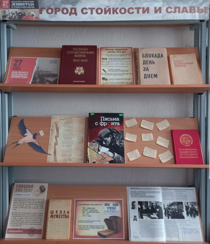 На выставке представлены материалы, рассказывающие о блокаде Ленинграда — книги, свидетельства очевидцев, письма с блокадного города и фотографии.