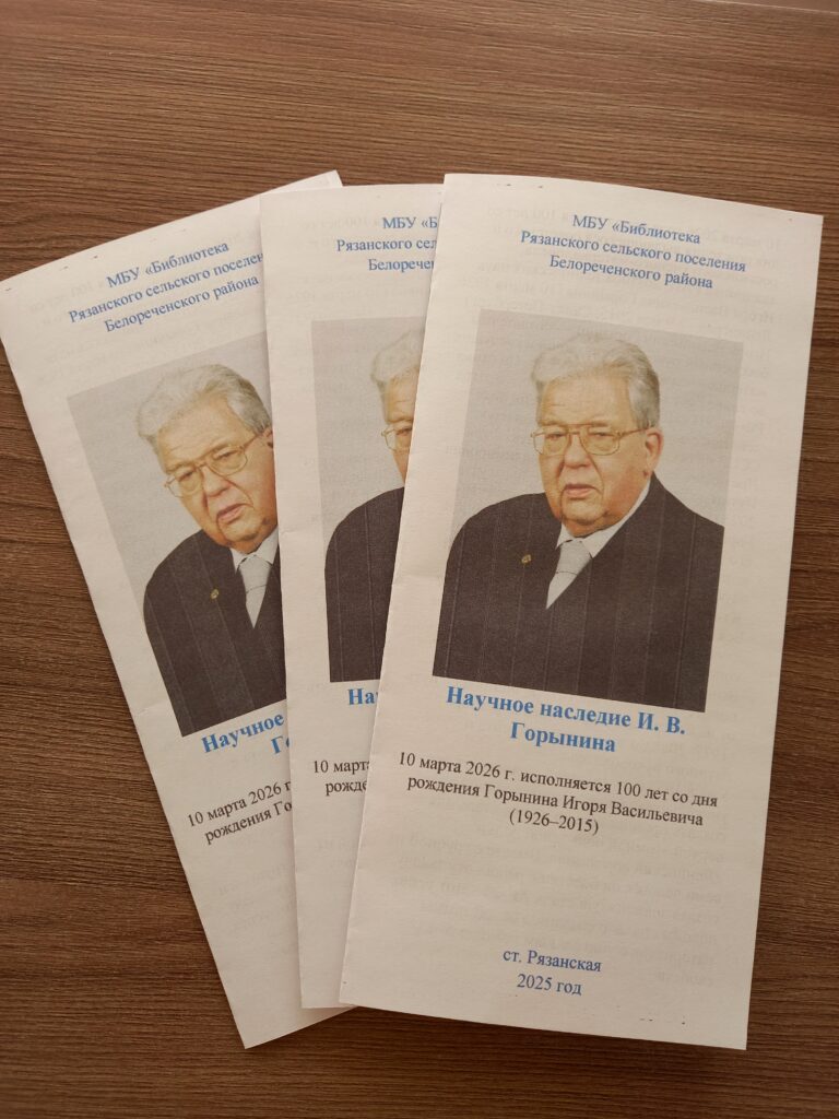 10 марта исполнилось 100 лет со дня рождения Игоря Васильевича Горынина (1926 – 2015 гг.) – металлурга, инженера, одного из ведущих мировых ученых-металловедов. Его разработки позволили создать уникальные материалы, обеспечившие строительство всего современного российского флота, а также морских установок газо- и нефтедобычи. В соответствии с указом Президента РФ, юбилей И.В. Горынина отмечается на национальном уровне. К этой дате в библиотеке станицы Рязанской был выпущен и распространён буклет «Научное наследие И.В. Горынина»