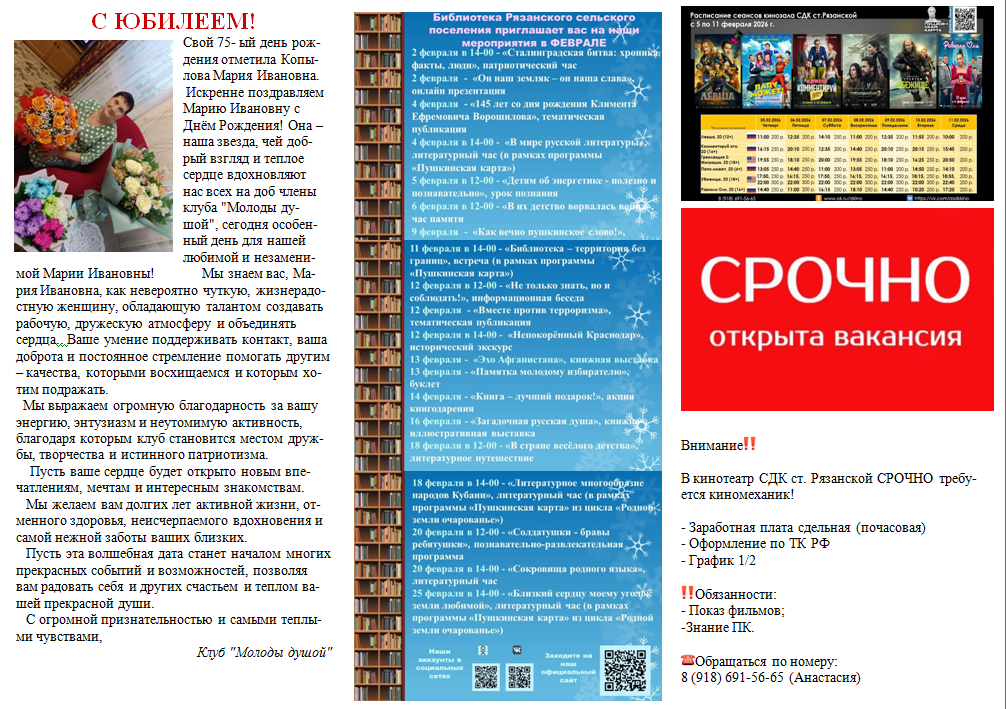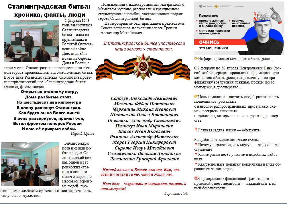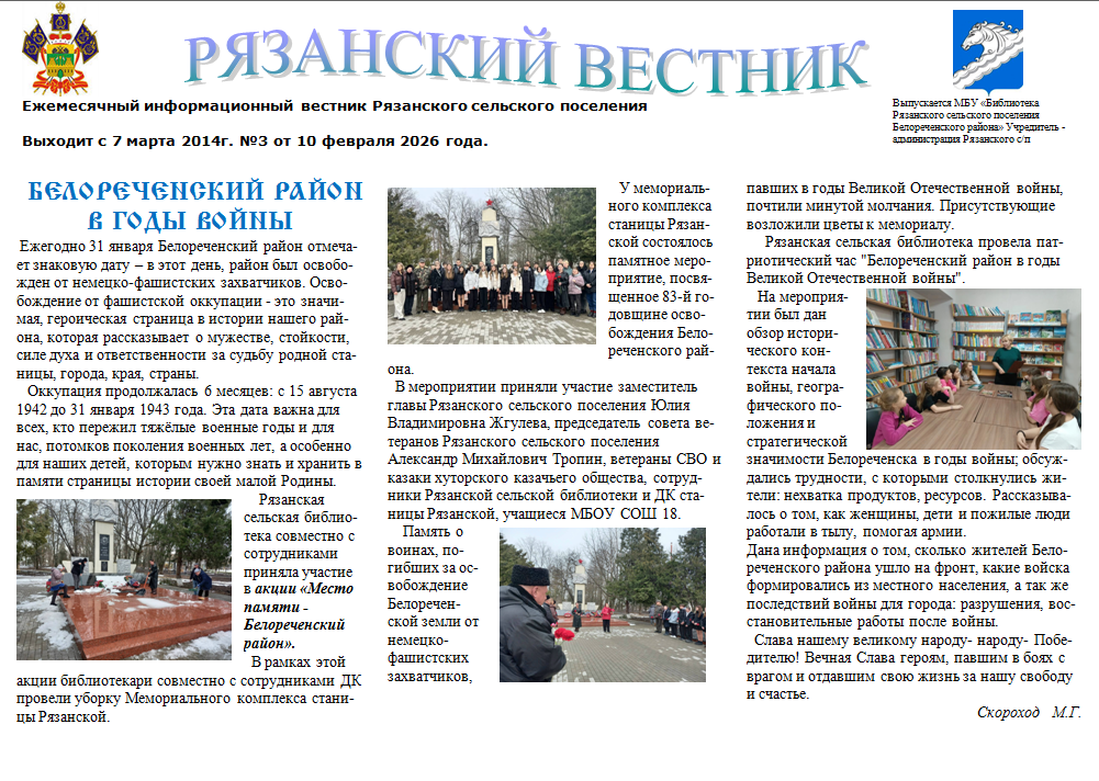 09.02.2026 - Газета, Краеведение, Краеведение Рязанской СБ, Мероприятия, Мероприятия Рязанской СБ, Новости, Рязанский вестникРязанский вестник. Выпуск N°3 от 10 февраля 2026 года. https://vk.com/wall-202275261_3105 https://ok.ru/profile/580519907980/statuses/158958420370828 https://t.me/c/2002491416/3628 Просмотров: 82
