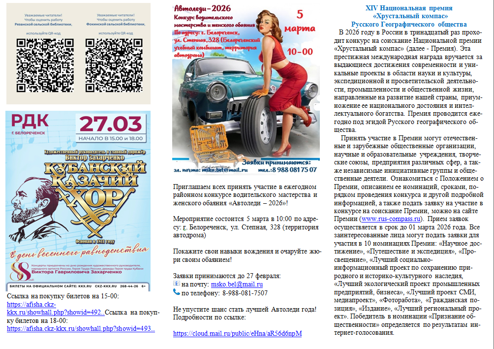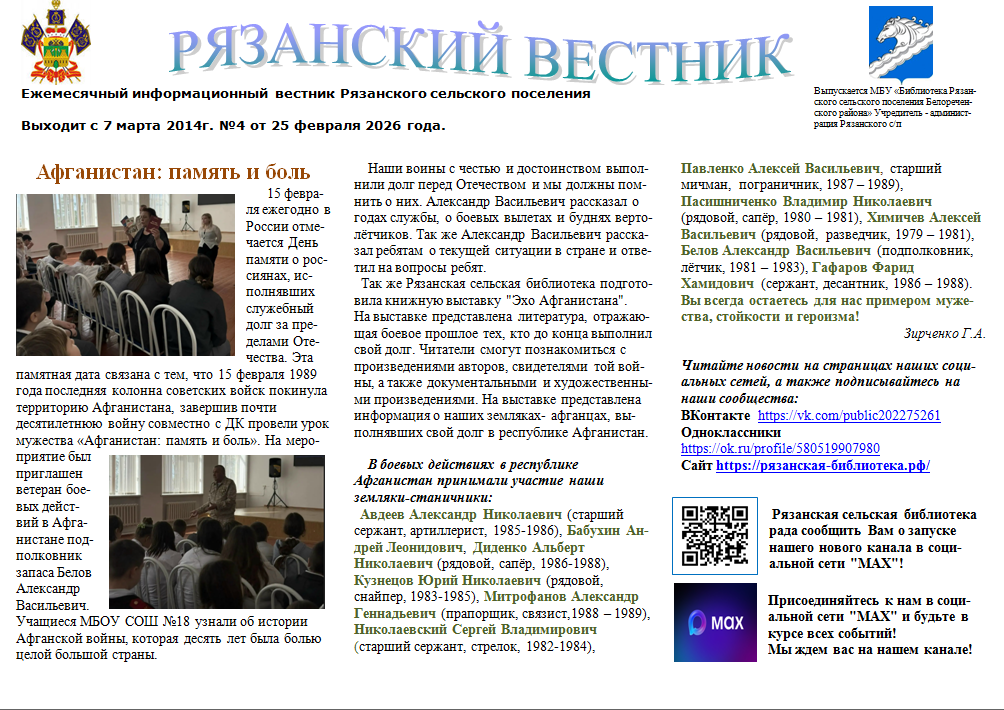 25.02.2026 - Газета, Краеведение, Краеведение Рязанской СБ, Мероприятия, Мероприятия Рязанской СБ, Новости, Рязанский вестникРязанский вестник. Выпуск N°4 от 25 февраля 2026 года. #рязанскаябиблиотека #белореченскийрайон #библиотекикубани #ялюблючитать #читающийбелореченск #рязанскийвестник https://vk.com/wall-202275261_3145 https://ok.ru/profile/580519907980/statuses/158987110524300 https://max.ru/id2303025777_gos/AZyT0V7NP_c Просмотров: 76