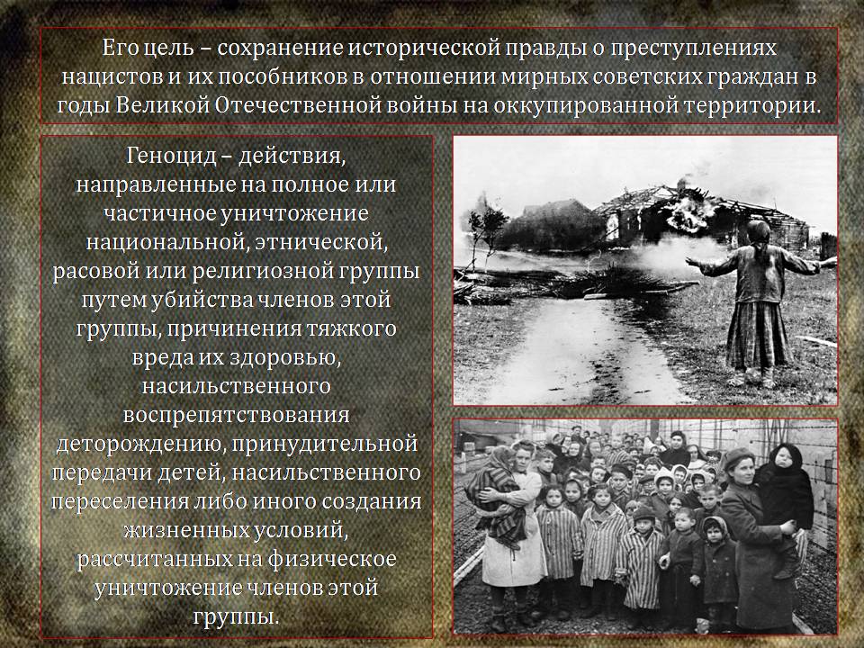 Целью которого является сохранение исторической правды о преступлениях нацистов и их пособников в отношении мирных советских граждан и военнопленных красноармейцев в годы Великой Отечественной войны на оккупированной территории и формирование неприятия нацизма в любых его проявлениях – как в исторической ретроспективе, так и в современности.
