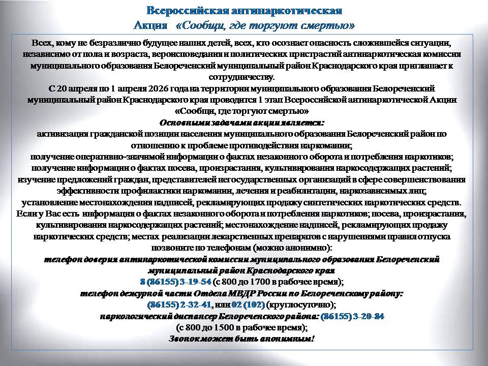 15.04.2026 - Мероприятия, Мероприятия Рязанской СБ, НовостиТематическая публикация «Сообщи, где торгуют смертью». https://vk.com/wall-202275261_3330 https://ok.ru/profile/580519907980/statuses/159070150600076 https://max.ru/id2303025777_gos/AZ2QnZfkQB8 Просмотров: 25
