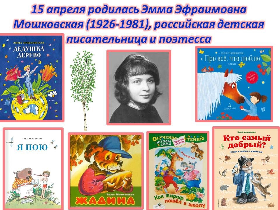 15 апреля 2026 года исполняется 100 лет со дня рождения ЭММЫ ЭФРАИМОВНЫ МОШКОВСКОЙ (1926–1981), выдающейся советской детской поэтессы и писательницы, чьи яркие, игривые и добрые стихи, наполненные фантазией и юмором, занимают важное место в русской детской литературе. Она автор книг: «Дядя Шар», «Шла дорогой крынка», «Зевота у бегемота», «В путь, в путь, в путь!», «Вежливое слово», «Разоделся народ», «Приходите, приходите в этот дом!», «Не пора ли на урок?», «Дождик вышел погулять» и др. Эмма Мошковская – автор более сорока поэтических сборников для детей, рассказов, сказок. По книгам Мошковской были сняты мультфильмы, выпущены диафильмы, пластинки с песнями на её стихи.